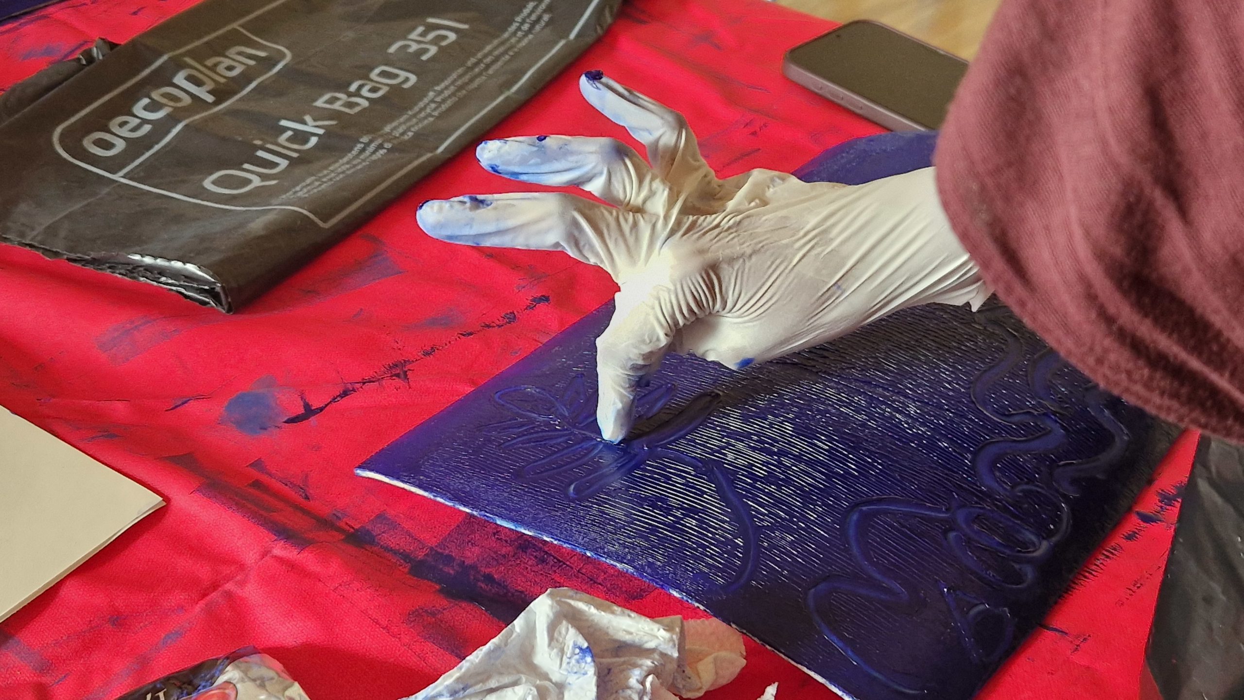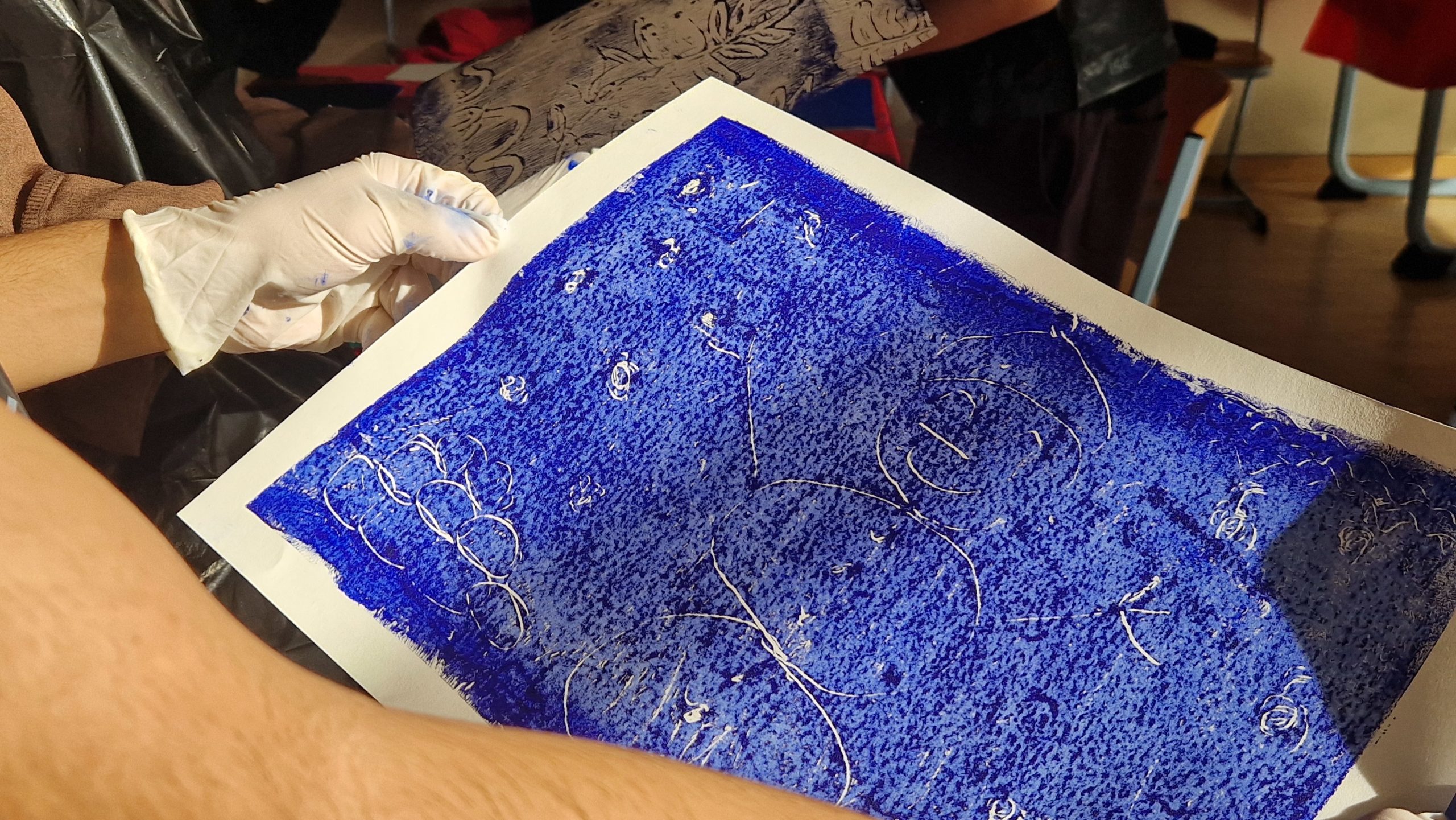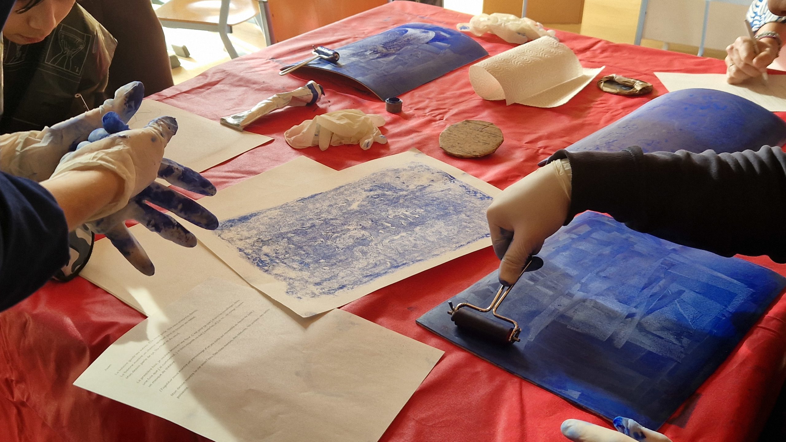 > un atelier de monotypes sur papier et sur tissu – déclinaison de bleu, expression créative telles les nuances de la mer.